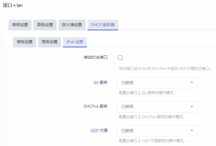 配置 lan 口,设置 ipv4 地址为主路由同一网段的 ip ,需要注意不要冲突了,然后设置网关为主路由的 ip ,设置子网掩码 255.255.255.0 ,还需设置 dns 为主路由的 ip ,不然 ap 本身无法解析域名。还需要关闭 dhcp 服务。