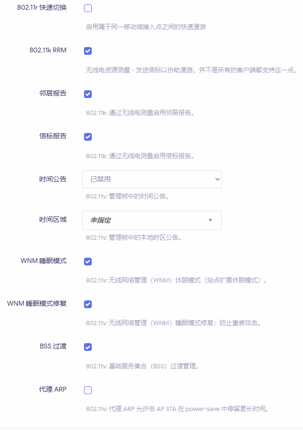 只开 802.11k 802.11v ,勾上 802.11k RRM 信标报告 邻居报告 睡眠模式 BSS过渡 。